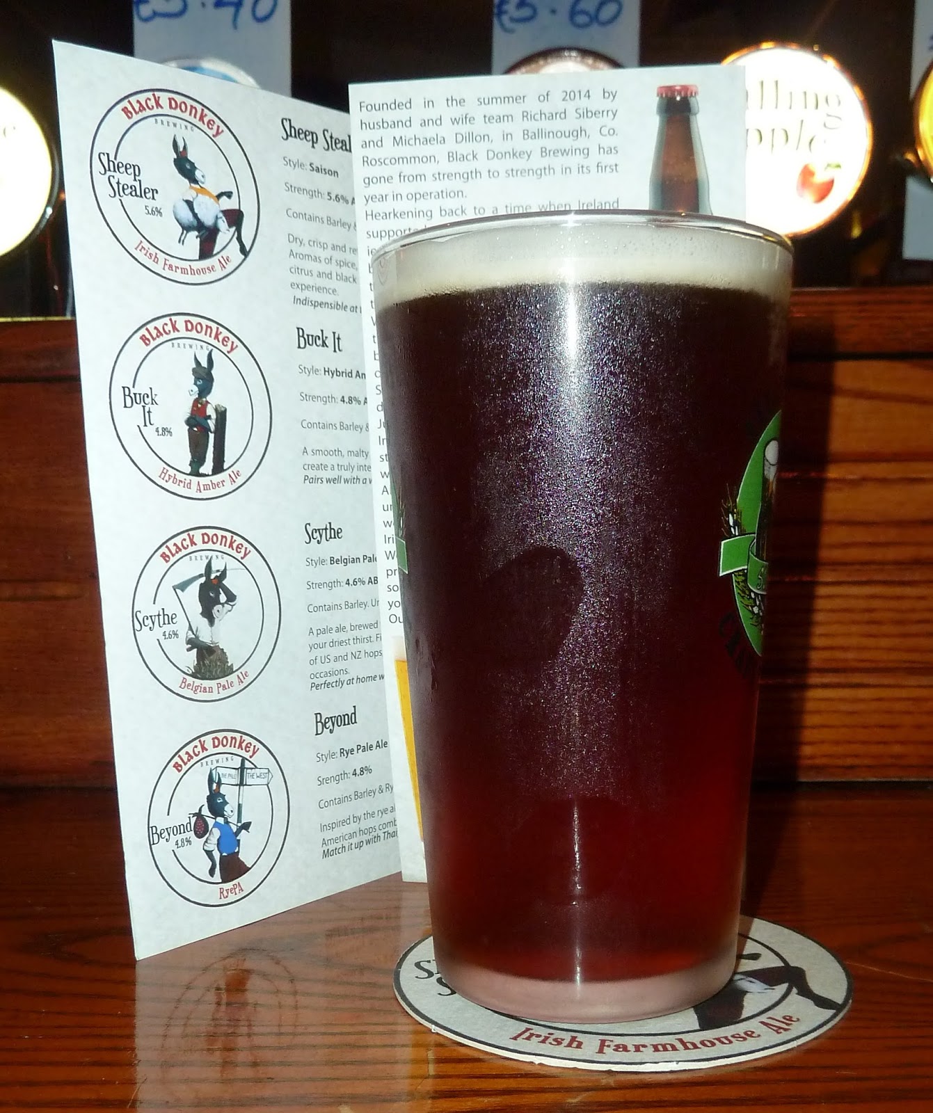 A quick dash to the pub before we go, and last month saw Roscommon's Black Donkey Brewery celebrating its first birthday in 57 The Headline with a tap takeover and a new addition to the line-up. Beyond is a rye ale, 4.8% ABV and dark red. Like the first edition of Buck-It, a neutral ale yeast has been used and also like the first edition of Buck-It it leaves the beer rather harsh: a dry-grass sharpness imbues the whole thing, with a weird strawberry jam sweetness on top. I feel it would benefit from having a few of the edges knocked off, but the brewery probably thinks the same about me. Scythe remains my favourite of the Black Donkey range.
