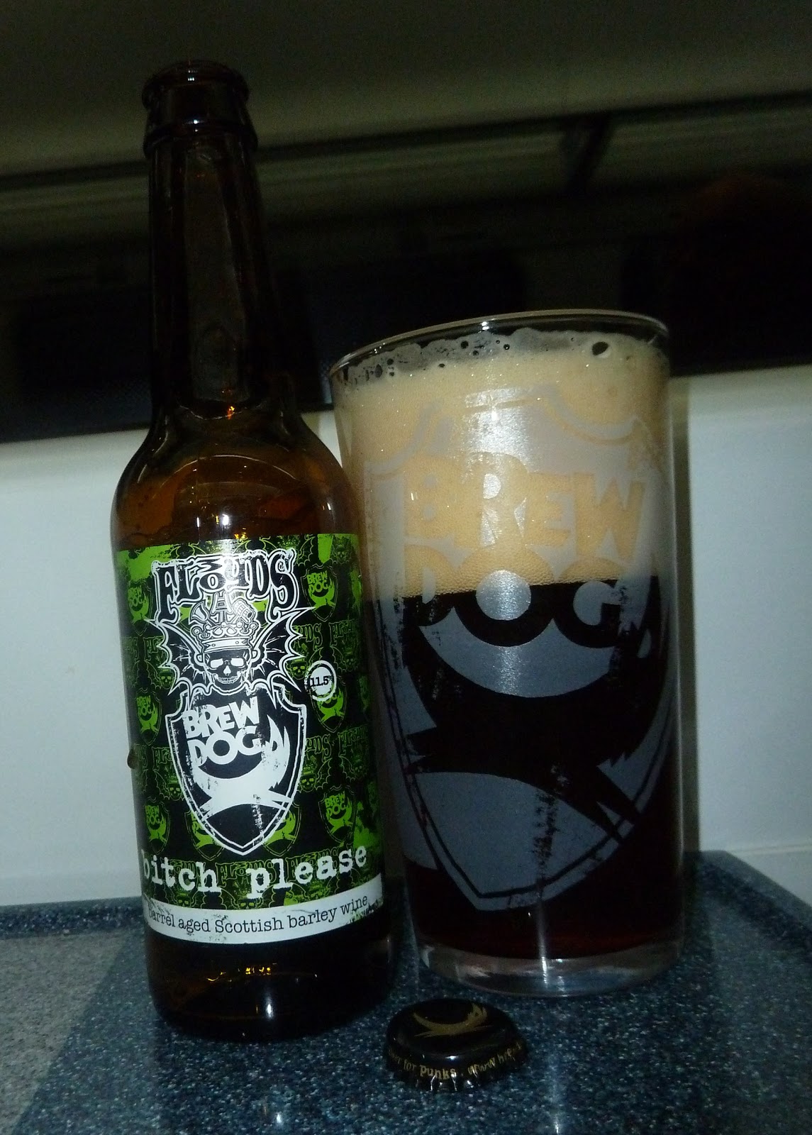 This barrel-aged barley wine was produced in association with Three Floyds and is all of 11.5% ABV. It smells it, with a serious boozy waft coming off the light beige head that sits thickly over the dark copper liquid. After the alcohol there's a blast of oak and then some peaty phenols: all this before even the first sip. The taste is as loud as one might expect, all blaring peatiness and alcoholic heat. The only vaguely subtle bit is a teeny hint of oxidised wet cardboard at the back, but that fades quickly. A mouth-coating viscosity means that at least you get good value for each mouthful: the flavours stay with you for quite a while. Like 5am Saint, this is perhaps a beer to finish a session on.Overall I found Bitch Please quite brash and unsophisticated, but it did last almost the whole way back across to the right-hand coast.