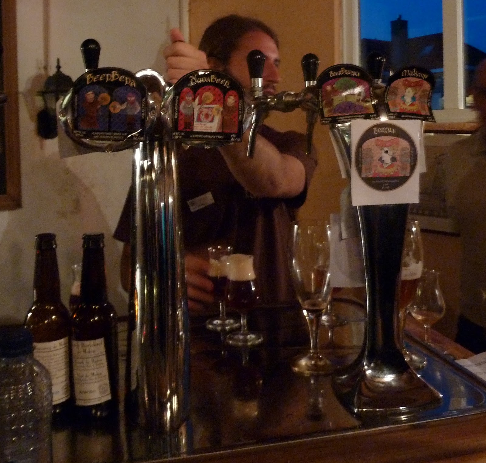 Dutch brewery Sint Christoffel had an unobtrusive stand in the back room of the windmill. Some interesting recipes, including a Wet-Hopped Wijs. Dry-hopped with wet hops, in fact. Suitably pale orange for a witbier, the hops do get a bit lost under the wheaty, worty malt, just arriving at the very end to add a mild grassiness. Perhaps I would have had better luck with the dry-dry-hopped version, but I didn't get round to it.