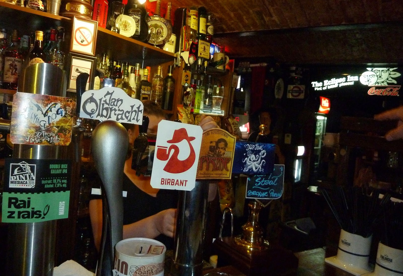 The final pub on the first evening was The Eclipse Inn: a dark, cosy, vaguely English-style basement watering hole. The first beer was on the house, and was the only non-Polish one I drank all trip: Rohozec Skalák Tmavé from the Czech Republic. It's a bang-on Czech dark lager, weighty and wholesome, with all the liquorice and coffee appropriate to the style. I followed it with Reden's Zniwa Chmielarzy on cask. The name (there's that word again!) means "Hop Harvest" as it's brewed with a variety of Polish hops. It's 6% ABV and arrived a murky dark red. There's lots of fake-fruit candy in the flavour, which I quite liked, and traces of mandarin too. A dash of coffee is as grown up as it gets. It could have stood to be colder and became a little cloying as it warmed, but not at all bad if consumed quickly.