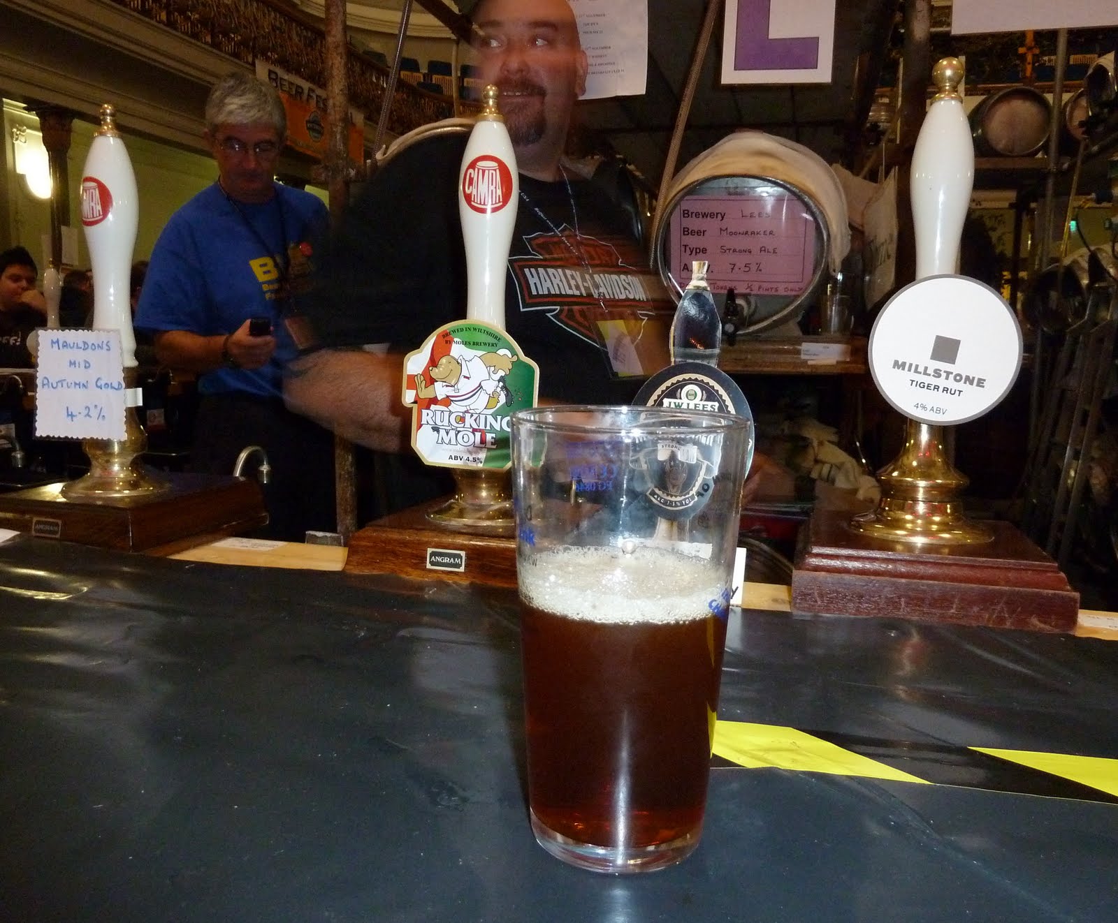 I'm not sure what to make of Bowland's Hunter's Moon: russet-red but extremely thin with a fair whack of sulphorous minerals in it. Perhaps it works best as a crisp and refreshing session ale but it didn't hit many of my buttons. And neither did Mole Brewery's Rucking Mole. Again, it had some nice dry notes, and even a hint of smoke, but not enough of either to keep me entertained. You can have your dark-amber ales either heavy-and-busy or light-and-boring, it seems.Time to lighten the mood, then. As always, Irish beers I've not had before are high on my list of priorities, so Whitewater's All That Jazz was an early sup. It's a pale shade of gold and very sweet with lots of that bubblegum flavour you get with certain UK blonde ales. Despite, or perhaps because, it reminded me of blue raspberry flavoured Slush Puppies I rather enjoyed it. Kelham Island's Pride of Sheffield was another interesting blonde, harmonising the pale malt sweetness with some lovely grassy Budvar-esque hops.
