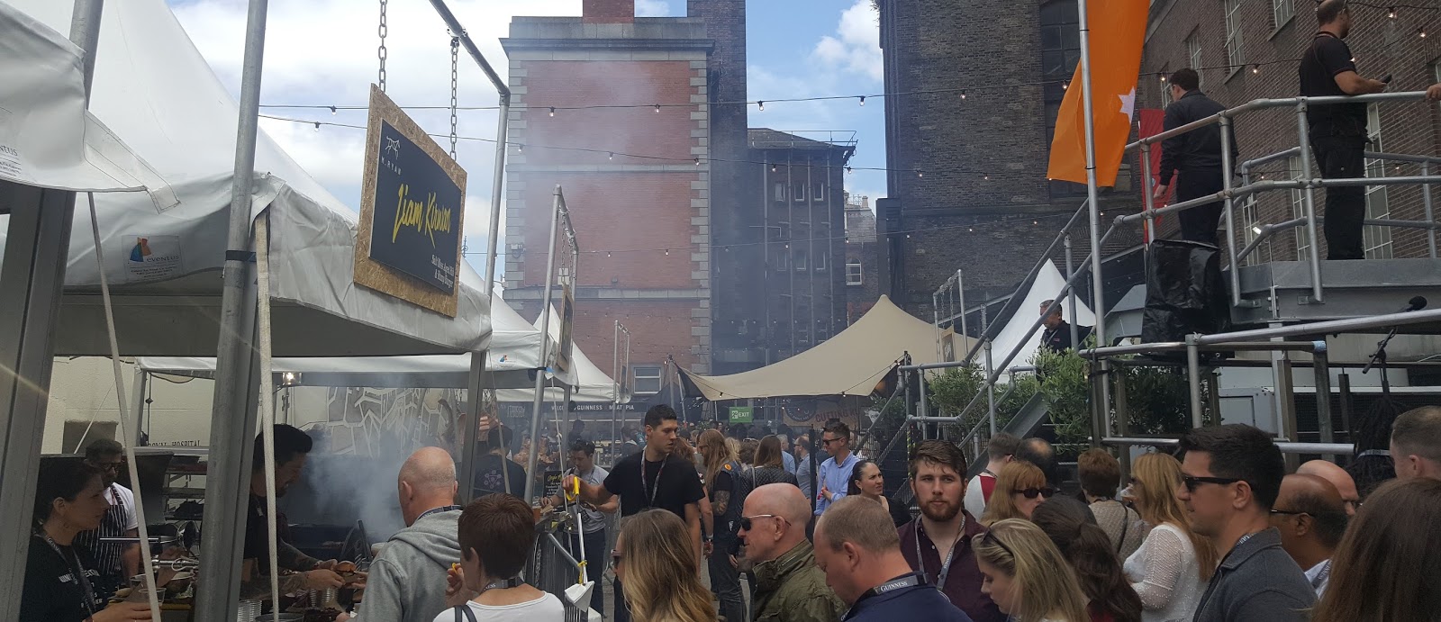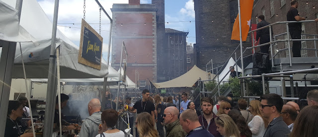 Meat! That was the theme of the Meatopia event which set up at Open Gate in early July; meat and smoke -- I came home reeking of both. The event has been running for some years now, in New York and then London, and this was its first time in Dublin, invited by Diageo to take over the yard outside their experimental brewery and brewpub for two days.The format involved six barbecue stalls, managed by people whose names may or may not be recognisable to those who move in foodie circles, each with a single signature dish and a matched sample of beer. Admission (Diageo's PR folk kindly comped mine) got you one of each pairing, plus a bonus pint from the bars: as well as the Open Gate's current selection, The Porterhouse, 5 Lamps, DOT and London's 40FT were also pouring.